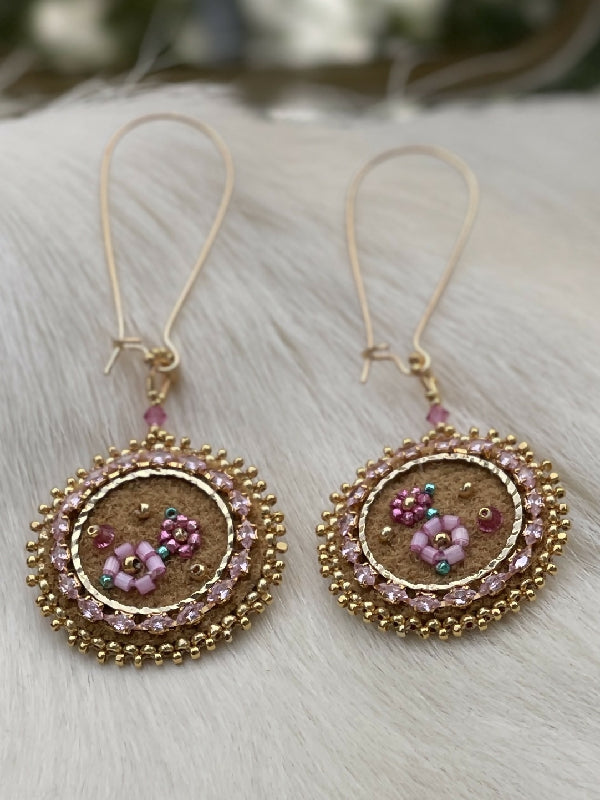 Satin silk pink and Charlotte cut fuchsia flowers w/ rose Swarovski crystals and light rose marquise chain, size 13 charlotte cut 24k gold beads and size 11 24k seed beads. On moose skin, backed with moose skin. Free delivery in Fairbanks.