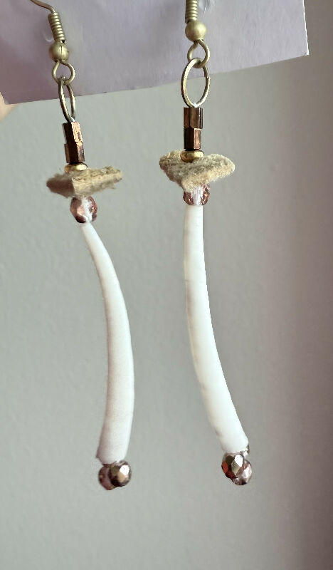 Dentalium shell earrings with bronze beads and tanned mooseskin.