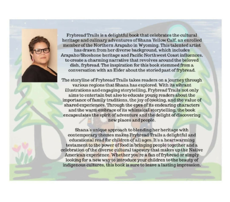 At 10 Buffalos, we proudly present "Frybread Trails - The Adventures Across Frybread Country." This captivating book follows Native American Tricksters journeying across Indian Country, where they discover the rich heritage of frybread, explore new locales, and forge new friendships. Authored by Shana Yellow Calf, Northern Arapaho, blending her Plains/Metis heritage with the PNW coastal influences, this book is a vibrant celebration of culture and culinary tradition. Additionally, enjoy a variety of frybread recipes that bring this beloved staple to your kitchen. Immerse yourself in an enchanting adventure while learning to make the perfect frybread.